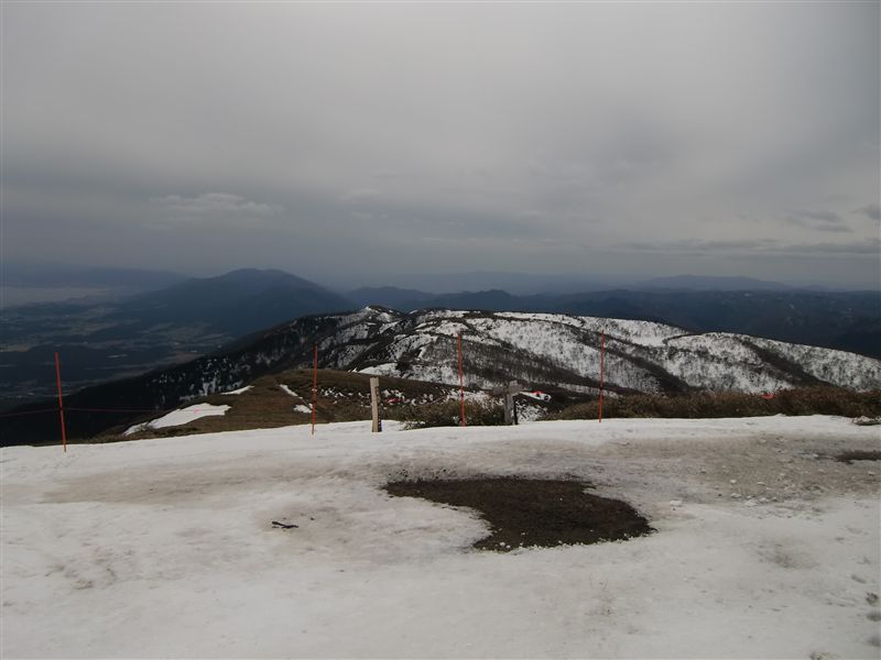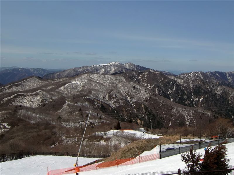 ロープウェイ頂上からは春の武奈ヶ岳がよく見える。冬の真っ白な姿より、春の方が針葉樹の青さが引き締まった姿に見え素晴らしい。ホーライパノラマゲレンデの頂上は当たり前だが、蓬莱山。頂上から小女郎池方面を見ると何人ものハイカーが見える。手頃な春山ハイキングとして人気があるようだ。