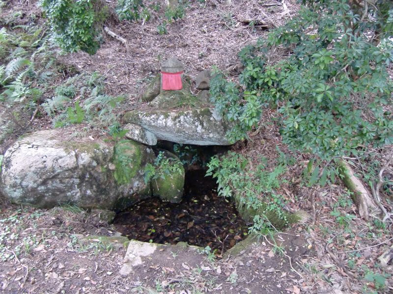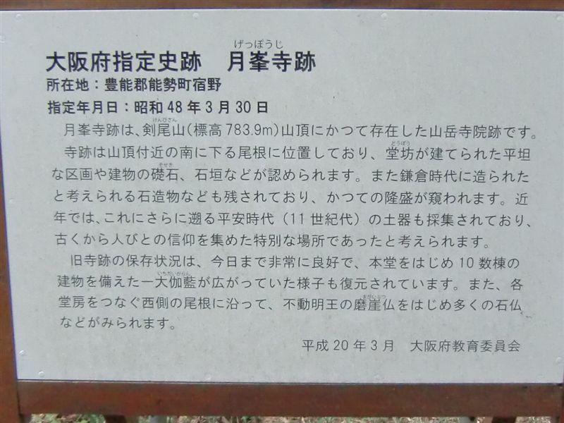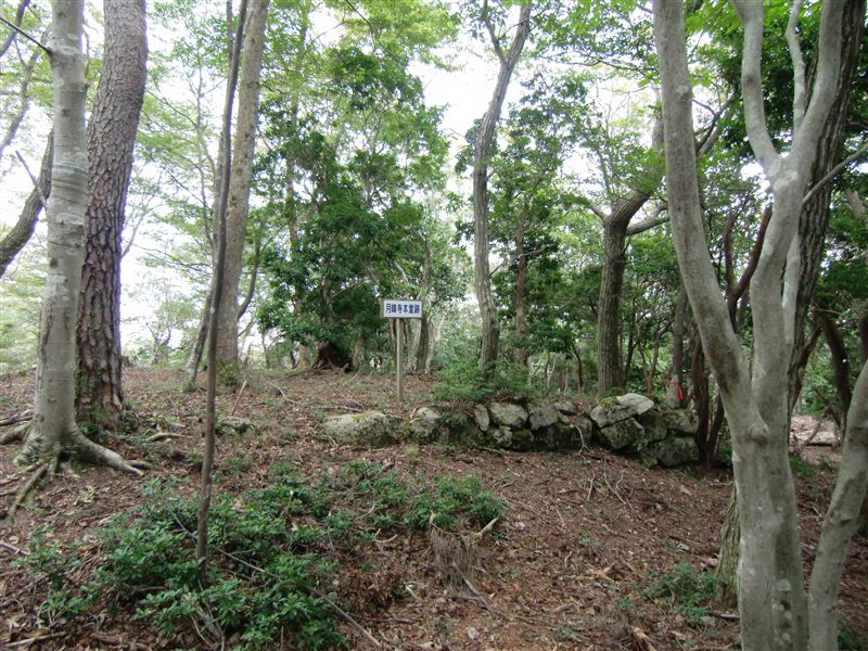 再び歩き始め、しばらく行くと大勢のグループが2組いたが、これらを追い越して12:00六地蔵で休憩をとる。休憩後少し歩くとすぐに月峯寺跡に着く。昔は多くの伽藍が建つ結構栄えたお寺だったらしい。ここには井戸というか水場の跡もあり、山頂のすぐ下にもかかわらず、今でも水が溜まっている。六地蔵から10分ほどで12:21頂上に着いた。以前の記憶ではもう少し距離があったように思ったのだがすぐであった。