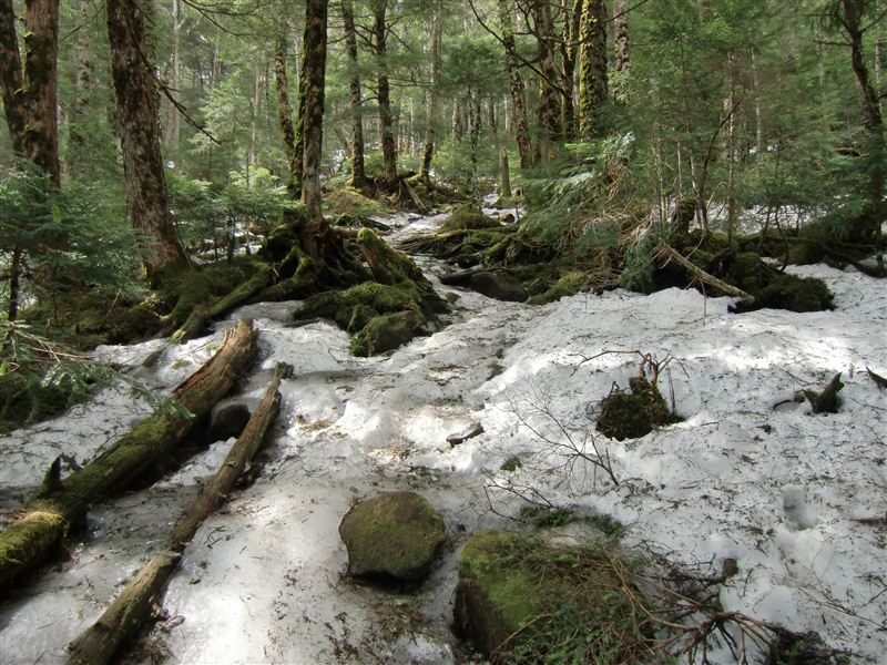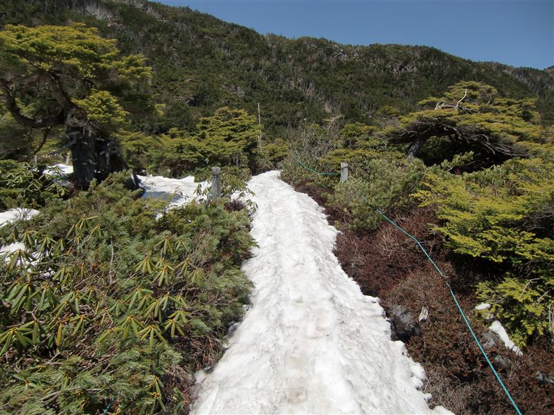 頂上からの下りも雪道だが、アイゼンが無いので結構苦労した。滑って落下しないように道の両脇の木の枝につかまりながらかろうじて下った。予定では三ツ岳、雨池山を回り頂上駅へ戻る予定だったが、三ツ岳の岩山で雪が残っていたら危ないと思い来た道を引き返した後、坪庭から八丁平の縞枯山荘まで往復した。