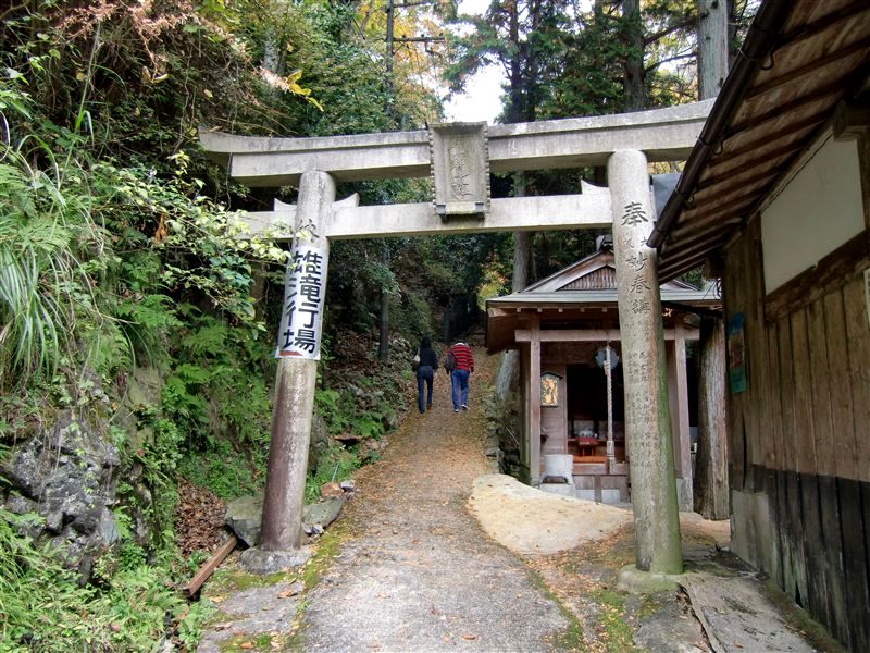 初谷を下ると道路に出て、しばらく行くと国道477号線に出る。国道を右へそのまま歩き25分でケーブルカーの駅につく。駅の右側が新滝道の入口である。地図では国道の途中から谷への入口が書いてあるのだが、分岐の標識が見あたらなかった。