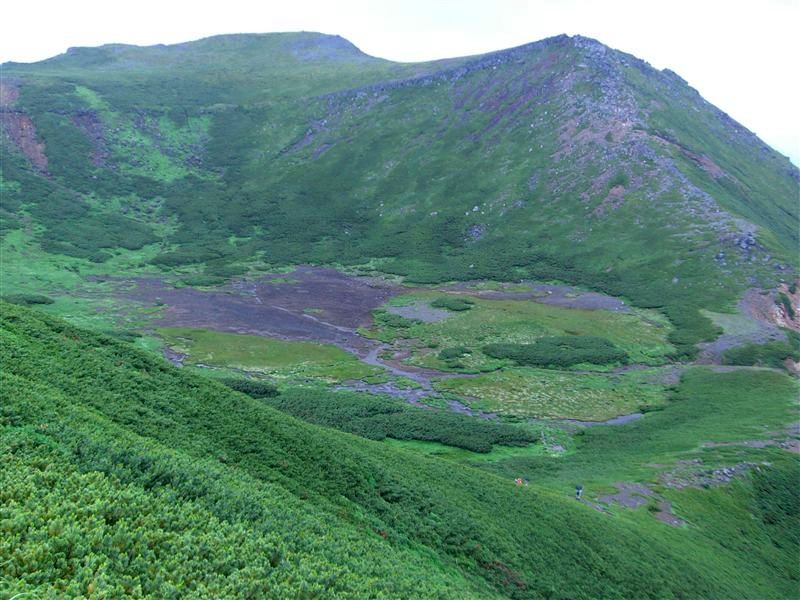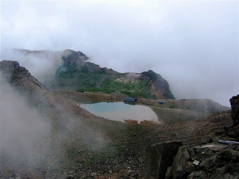 頂上から二ノ池を見下ろす。今日は天気が悪く、途中何度か雨が降った。今もかなり雲がかかっており、写真は雲が晴れた合間に撮ったものである。