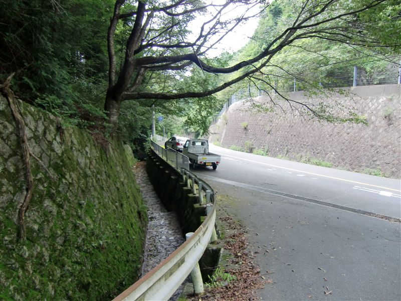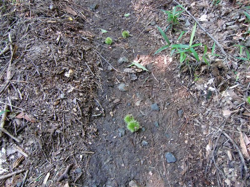 奥の院から今来た道を堀越峠まで戻り、道路を渡り反対側の道路の石垣に沿って急な坂道になっている登山道に入る。こちらの歌垣山への道は完全な山道である。早くも栗が道に落ちており、秋の兆しかとも思うが、35度を超える暑さではとても「秋」を感じることは無理である。