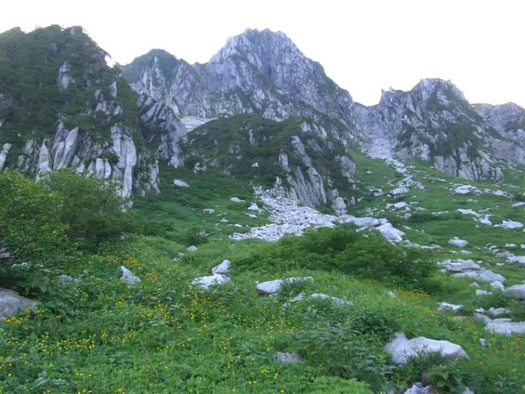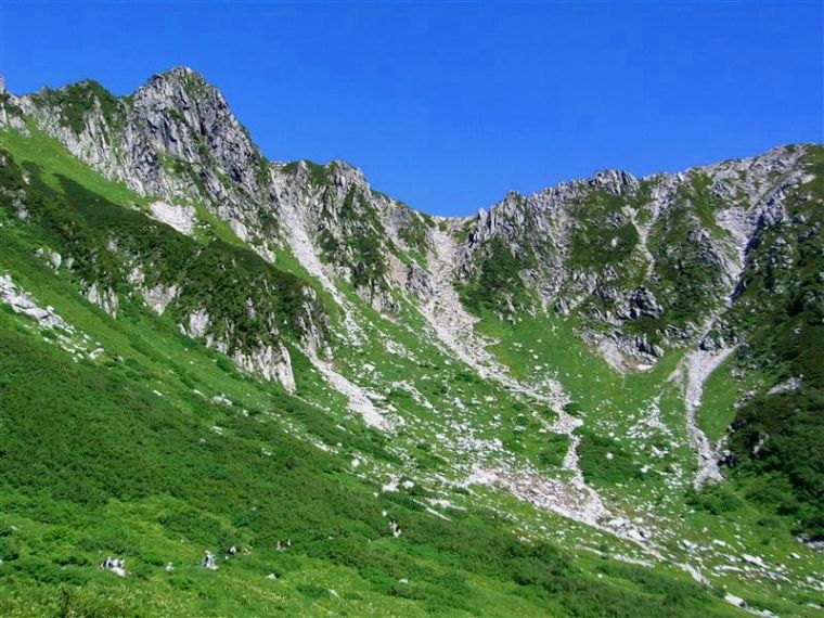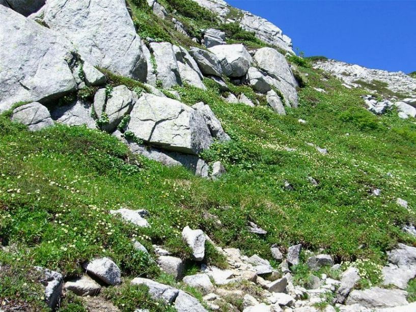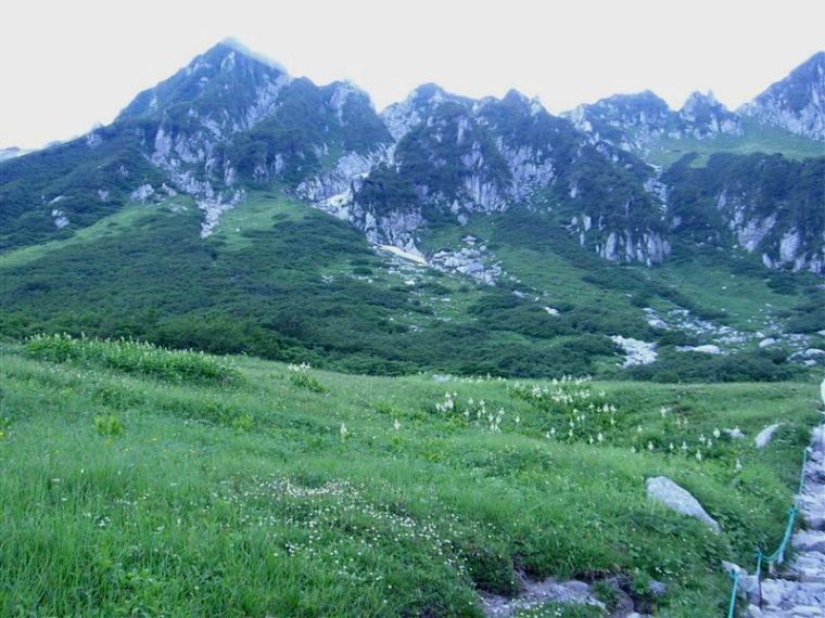 千畳敷上部から極楽平にかけてチングルマ、コバイケイソウ等のお花畑が急斜面を美しく飾り、苦しい登り坂も元気づけられ、改めて花の癒し効果を実感する。