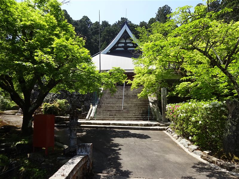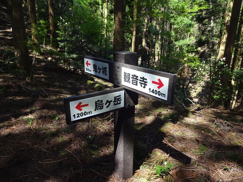 10:47 烏ヶ岳頂上着。頂上には中継アンテナ施設があり、あまり感じが良くない。少し休憩し11:00 烏ヶ岳を出発。 烏ヶ岳から下ると林道に出たが、観音寺への案内板がなく道が分からずうろうろして20分位ロスタイム。注意して見ると案内板が無いが、これだろうと思われる道が分かりそこを下る。選んだ道が正しく11:35 分岐点に到着。そこからはどんどん下り11:55 観音寺到着。 観音寺を参拝。楓の若葉が非常に美しく、秋の紅葉もおそらく綺麗だろうと思われる。 時間が早かったので山の上で昼食をとらなかったので車の中で昼食とり、12:26 出発し14:19 帰宅した。 鬼ヶ城はどんな山かと期待して登ったが、特に特徴の無い平凡な山であった。